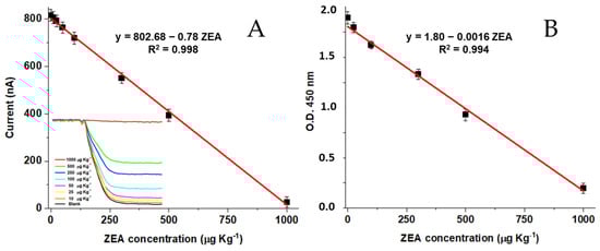 (A) Calibration curve of the OMPD (inset: electrochemical signals), and (B) commercial ELISA kit for ZEA determination.