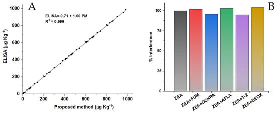 A comparison of the analytical capabilities of the method developed using OMPDs with the traditional ELISA analysis was conducted. ZEA standard solutions were analyzed across a wide range of concentrations. In Figure 6A, the correlation between the results obtained by both methods is depicted; the resulting curve presents a slope close to 1 and an R2 value of 0.999. This result exhibited the correspondence between both methods, thereby emphasizing the notable analytical capabilities of OMPD. Moreover, the total time of the assay procedure for ZEA determination was 10 min, less than the time required to perform the ELISA test. The selectivity of the OMPD for ZEA determination was studied against a 100 µg Kg−1 ZEA standard solution containing some typical mycotoxins (Fumonisin, Ochratoxin, Aflatoxin, T-2 Toxin, and Deoxynivalenol) in five-fold concentration. As can be seen in Figure 6B, the mycotoxins induced less than a 3% variation in the analytical signal. The results demonstrate the selectivity of the system for its subsequent application.