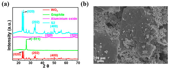 The microstructure of tungsten oxide, graphite and alumina oxide and the as-prepared composite S2 were examined by XRD, as shown in Figure 2a. The characteristic diffraction peaks at 23.55°, 34.11° and 49.88° can correspond well to the (020), (202) and (400) planes of WO3 nanoparticles, respectively, and they can be indexed to the structure of WO3 (JCPDS No.83-0950). No other secondary phases or impurity peaks were observed. This indicates the high purity of the synthetic WO3/Al2O3/graphite composite materials. To further understand the surface morphologies of the synthesized samples, their surface morphologies were characterized by scanning electron microscopy (SEM), as shown in Figure 2b and Figure S1. As can be seen from the figures, the WO3 and Al2O3 nanoparticles are tightly attached to the graphite sheets. But with the increase in the Al2O3 nanoparticle content, Al2O3 nanoparticles will also attach to the surface of WO3 and agglomerate together. The phenomenon of agglomeration is not conducive to the gas-sensing performance, which indirectly indicates that the content of Al2O3 nanoparticles in the composites will have an optimal value.