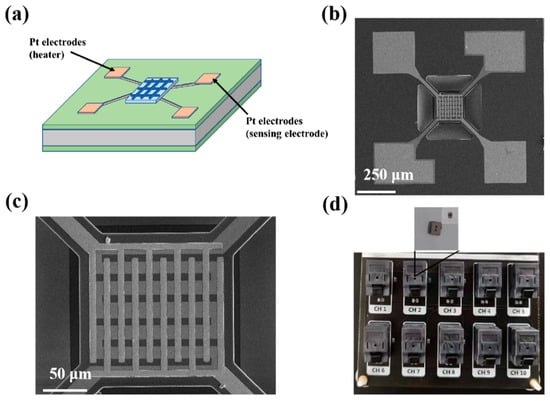 The MEMS-based 2-CEES gas sensor used in the experiments: (a) Schematic diagram of MEMS chip. (b,c) SEM images of the planar view of MEMS chip. (d) Schematic diagram of MEMS sensor array, the vignette is the enlarged photograph of the gas sensor.