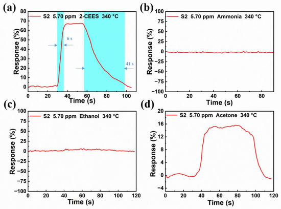 Next, the response time and recovery time of the sensor based on sample S2 were studied, and the response time and recovery time to 5.70 ppm of 2-CEES at different temperatures are shown in Table 1. It can be seen that the higher the operating temperature, the shorter the response time and recovery time. This is because the higher the operating temperature, the stronger the adsorption and desorption ability of the gas on the sensor surface. Next, the selectivity of the sensor based on sample S2 was investigated. Figure 4b and Figure S3 exhibit the sensing responses of the S2 sensor to 5.70 ppm of 2-CEES and interfering gases (ammonia, ethanol, acetone and acetonitrile) at different temperatures. As can be seen from the figure, when the operating temperature is 260 °C, 300 °C, 340 °C and 440 °C, the response to ammonia, ethanol and acetonitrile is relatively low and changes little, and the response to 5.70 ppm 2-CEES was much higher. However, as the working temperature increases, the response to acetone is improved. Therefore, to sum up, the optimal operating temperature of the sensor based on sample S2 is 340 °C. At this time, the response to 2-CEES gas with a concentration of 5.70 ppm was 69%. The response of 2-CEES is almost 6 times higher than that of ammonia and ethanol, 3 times higher than that of acetone and 70 times higher than that of acetonitrile. The response time and recovery time of the sensor based on sample S2 to 5.70 ppm 2-CEES gas were 5 s and 42 s, respectively, as shown in Figure 4c. The sensing response of the sensor to 0.10 ppm 2-CEES at the temperature of 340 °C is shown in Figure 4d. When 0.10 ppm 2-CEES is injected, the S2 sensor has 27% response, indicating that the sensor can detect 2-CEES gas with low concentration. This helps its application in real life to detect 2-CEES gas and can detect the leakage of 2-CEES gas as soon as possible.