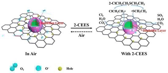 Subsequently, at a certain temperature, the sensor is transferred to the 2-CEES atmosphere, and 2-CEES is rapidly decomposed into ClCH2CH2· and·SCH2CH3. Due to the strong electrophilic properties of Cl and S, when they are adsorbed on the surface of the sensing material, they will react with , are quickly oxidized and release a large number of electrons. The reactions are described by Equations (5) and (6). These free electrons will be transferred to the conduction band of the sensing material. The concentration of free electrons in the conduction band increases, resulting in the decrease in the depletion layer and the corresponding decrease in the resistance of the sensing material [33], as shown in Figure 8.