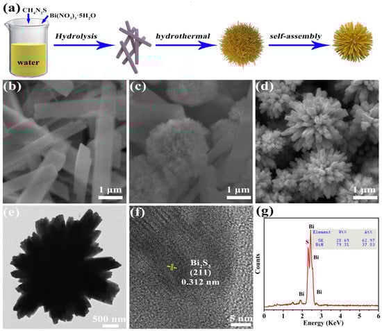Figure 1. (a) Schematic illustration of the formation process of hierarchical Bi2S3 nanomaterials. SEM images of the hydrolysis product (b), the as-prepared sample with a 1 h hydrothermal reaction time (c), and the sample with a 12 h reaction (d); TEM (e) and (f) HRTEM images; and the EDS spectrum of the BS-12h sample (g).