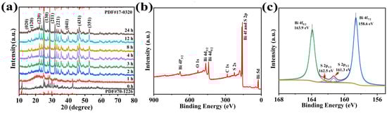Figure 2. (a) XRD patterns of prepared samples with different reaction times. (b) XPS survey; (c) Bi4f and S2p core level spectrum of the BS-12h sample.