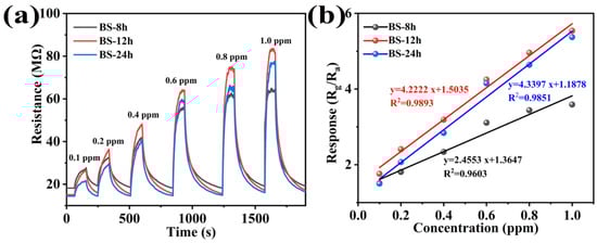 Figure 3. RT NO2 sensing performance of BS-8h, BS-12h, and BS-24h samples: (a) dynamic sensing response curves and (b) the corresponding linear relationship between sensitivity and NO2 concentration ranging from 0.1 to 1.0 ppm.