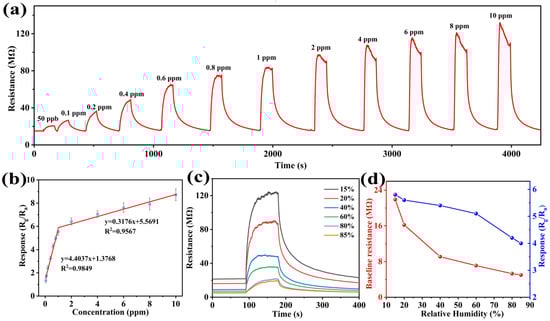 The RT dynamic response curve of the BS-12h sensor with varied NO2 concentrations is shown in Figure 4a. The recorded real-time response resistance value exhibits an increasing trend when the concentration of NO2 increases from 50 ppb to 10 ppm. The main reason may be associated with more NO2 molecules trapped on the surface of hierarchical nanomaterials and obtaining more electrons from the surface of the Bi2S3 nanostructure. Meanwhile, the BS-12h sensor displays fast response speed and full-recovery sensing properties, which could be ascribed to the hierarchical nanostructures of the Bi2S3 materials. These results confirm the BS-12h sensor can effectively realize low-concentration NO2 detection from 50 ppb to 10 ppm at RT. The sensor based on hierarchical Bi2S3 nanostructures displays two sectional linear relations between sensitivity and NO2 concentration from 0.05 to 2 ppm and 2 to 10 ppm (Figure 4b). These phenomena were associated with decreasing carrier mobility due to the scattering effects of adsorbed gas molecules on the surface of sensing materials [46,47].