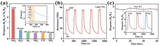 Figure 5. The RT NO2 sensing properties test of the BS-12h sensor: (a) Anti-humidity ability to 1 ppm NO2 under different relative humidity. (b) Baseline resistance and sensitivity to 1 ppm NO2 under varied humidity environments. (c) Long-term stability.