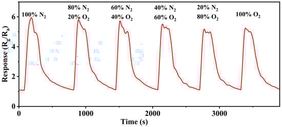 The sensing mechanism of metal sulfide nanomaterials relies on the electron-migration case between the surface of nanostructures and adsorbed target gas molecules [58,59,60]. The Bi2S3 nanomaterials as n-type semiconductors exhibit increased resistance during the electrophilic NO2 sensing process. In order to confirm the role of O2 molecules during the NO2 sensing process of Bi2S3 nanostructures, a dynamic gas dilution system was adopted to control the O2 concentration during the NO2 sensing test process. The dynamic NO2 sensing curve with different O2 concentrations and N2 as a balance gas is shown in Figure 6. The BS-12h sensor based on hierarchical Bi2S3 nanostructures shows an optimum dynamic response/recovery process to 1 ppm NO2 in different O2 concentrations. The sensitivity of the BS-12h sensor displays a decline trend, which could be associated with more O2 molecules trapped on the surface of Bi2S3 nanostructures with the increasing O2 concentration [30]. The RT resistances of the prepared Bi2S3 nanostructures under different O2 concentrations (N2 as a balance gas) are shown in Figure S7. The resistance value of Bi2S3 nanostructures in a 100% N2 atmosphere is the smallest and exhibits a gradually increasing trend with increasing O2 concentration. The phenomenon confirms that O2 molecules can be trapped on the surface of Bi2S3 nanostructures and capture electrons from their conduction band to form O2. Upon exposure to NO2, these NO2 molecules competitively adsorb on the sensing active sites and trap the electron to form NO2. The little fluctuation in the sensing response of the Bi2S3 nanostructures can be associated with the much bigger adsorption energy of NO2 molecules than that of O2 molecules [26]. The result confirms that ambient O2 molecules are not directly involved in NO2 sensitive processes in Bi2S3 nanomaterials. The electron transfer process between the NO2 molecules and Bi2S3 nanostructures could be depicted using the following equation:
