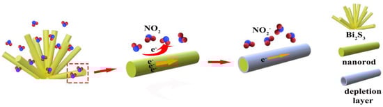The schematic diagram of the NO2 sensing mechanism of hierarchical Bi2S3 nanostructures is shown in Figure 7. The NO2 molecules adsorb on the surface of the Bi2S3 nanostructure and trap electrons, which leads to decreased electron density in Bi2S3 and the formation of an electron depletion layer. The formed electron depletion layer on the surface of the sensing materials will cause the resistance of the Bi2S3 nanomaterials to increase. When the Bi2S3 nanostructure is re-exposed to air, NO2 molecules gradually finish the desorption process and release the electron to the surface of Bi2S3, which results in the resistance value of the sensor recovering up to its baseline resistance.