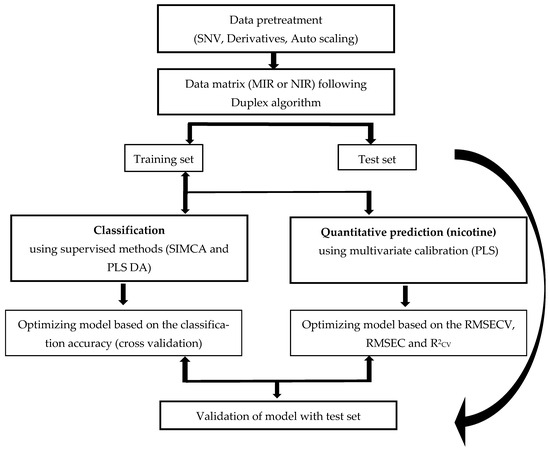 The general steps of the procedure followed during the data or chemometric analysis of the collected (N)IR data are represented in Figure 1.
