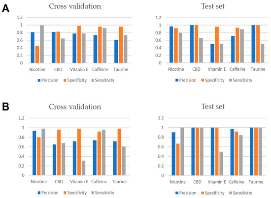 Qualitative models were constructed using the spectra of all samples in the sample set. Initially, PCA was applied to explore the potential discriminatory capability between samples containing the targeted compound and other samples within the dataset (results not shown). Subsequently, binary supervised classification models were developed, using both SIMCA and PLS-DA. The sample set was categorized into five distinct groups of samples, i.e., nicotine-containing samples, caffeine-containing samples, taurine-containing samples, vitamin E-containing samples and finally CBD-containing samples. The objective of these models was to effectively classify and distinguish samples, based on the presence of the targeted molecules. Table 2 and Table 3 and Figure 2 and Figure 3 show for each combination of spectroscopic technique, chemometric technique and target molecule, the performance of the best model obtained and their sensitivity, precision and specificity. For the ideal model, values for sensitivity, precision and specificity would be 1.00.