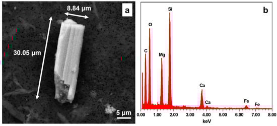 In Figure 1, an example of a bundle of fibers, observed inside healthy tissue from case #9, is reported to better display the characteristics of a non-breathable fiber (see Introduction for the morphological parameters). In this case, the length of the particle is about 30 μm, respecting the first parameter. Nevertheless, the diameter is about 9 μm, so it cannot be deemed a “regulated fiber”. Lastly, the aspect ratio is 3.4, meaning that it can be considered a fiber. The EDS-obtained chemical composition allows us to ascribe this elongated particle to tremolite, the Mg end-member of the Ca amphiboles of asbestos, with the theoretical chemical formula Ca2Mg5[Si8O22](OH)2 [24,25]. From the chemical point of view, this particle shows a composition comparable to one of the “asbestos” phases; nevertheless, the morphological parameters do not allow us to classify it as a regulated fiber.