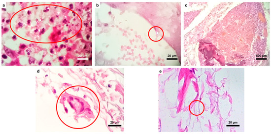 Furthermore, histological structures typically related to chronic inflammation, such as lymphocytes, histiocytes, plasma cells, and granulomas (Figure 2d), are found close to inorganic deposits. Figure 2d,e show, respectively, a multinucleated histocyte phagocytosing amorphous material and, in the red circle, a small fiber.