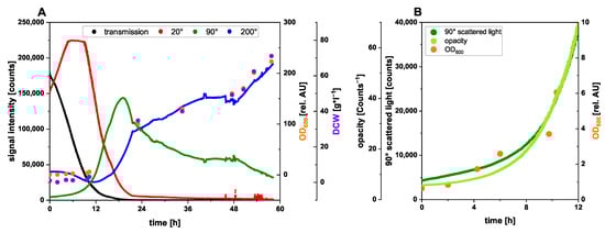 Figure 1. Monitoring of a fed-batch cultivation with Komagataella phaffii [20]. (A) Scattering in various angles with offline measurements of optical density (OD) and cell dry weight (DCW). (B) the opacity is compared to the 90°-scattered light for optical densities (OD) up to 10.