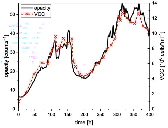 The opacity, measured using the NIR scattering flow cell, correlates with the VCC very well. The transmission signal was selected because of its good sensitivity during low- to mid-range turbidity states. Opacity was calculated to obtain a proportional signal response to the cell count. The sensor enables the quick and accurate monitoring of an increase and decrease in VCC without any volume loss. Furthermore, stationary phases can be identified as well. There are some outliers, which show significant deviation from offline data (e.g., at 250 h). These are mostly due to debris or cluster of cells accumulating in the measuring chamber. Therefore, a flushing routine is sensible to avoid artefacts in the data. Short-time outliers were smoothed by applying a median filter to the data.