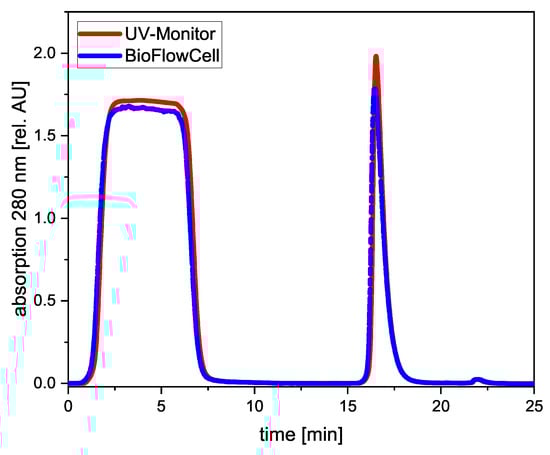 The downstream process, which is highly relevant for product quality, was also monitored with the developed BioFLowCell to demonstrate the possibilities for automation and quality control. To observe the purification process of a monoclonal antibody, the flow cell was connected to an ÄKTA pure chromatography system (GE Healthcare, Uppsala, Sweden) via PEEK tubing (i.d. 0.5 mm) and flangeless fittings (1/4″—28 UNF). A flow cell with a path length of 1.2 mm was placed into a reusable flow cell holder. To measure the absorption spectra, a spectrometer (TIDAS S520 1994 DH, J & M Analytik AG, Essingen, Germany) was connected via SMA-terminated optical fibers to the flow cell holder. Dark-corrected intensity spectra were recorded, processed and exported as spc-files with TIDASDAQ3 Software (J & M Analytik AG, Essingen, Germany). Integration time (It) was adjusted to guarantee an optimal detector saturation of 80%. Measuring frequency was set to 250 ms. Reference measurements were conducted with the internal single wavelength UV monitor (U9-L, Cytiva Europe GmbH, Freiburg, Germany) in a flow-through cuvette of 2 mm path length.