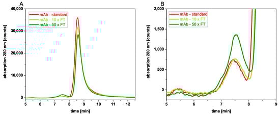 The SEC-HPLC column efficiently separated the aggregate and the monomer peak (Figure 4). A distinct monomer peak can be observed after 8.5 min of retention. The aggregates leave the column beforehand at 7.5 min. The percentage of the aggregate peak to the total peak area was 2.17% (Table 1). Comparing the chromatograms of the different freeze–thawed samples, a shift from the mAb peak to the aggregate peak can be observed (Figure 4). An increasing number of cycles leads to a greater amount of aggregates. For 50 cycles of freeze–thawing, the peak area percentage of aggregates more than doubled up to 5.51%.