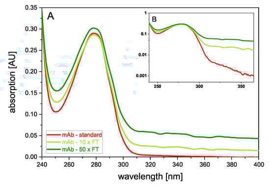 The recorded UV-Vis spectra of the aggregated samples are plotted in Figure 5A. All samples show the expected protein absorption peak at 280 nm. The control sample shows almost no absorption for higher wavelengths. Freeze–thawing leads to significant shifts in absorption, especially at 250 nm, and for wavelengths above 320 nm, whereas absorption at 280 nm remains nearly unchanged. The increased absorption level for higher wavelengths can be emphasized by logarithmic scaling (Figure 5B).