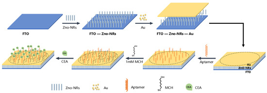 The preparation process of the aptasensor is schematically shown in Figure 1. First, 20 μL of the previously prepared CEA-sensitive aptamer solution was added dropwise onto the surface of pretreated electrodes with the FTO-ZnO-Au structure, which was incubated for 12 h at room temperature. Then, the electrode surface was rinsed with the PBS buffer (PH 7.4) to remove the aptamers that were not bound to the gold surface, and dried naturally at room temperature. After that, the previously prepared MCH solution (1 mM, 10 μL) was added dropwise onto the modified electrode surface, which was incubated for 30 min at room temperature to seal the non-specific binding sites. Then, the excess MCH on the electrode surface was removed with the PBS buffer (PH 7.4) to obtain an electrochemical aptasensor suitable for the detection of CEA. The prepared aptasensors were stored in a refrigerator at 4 °C for future use.