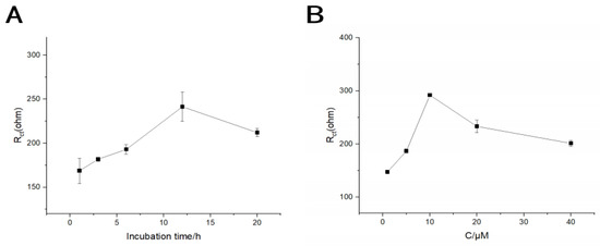 Optimizing the time of the incubate CEA-sensitive aptamer was an important step in building the electrochemical aptasensors. As we can see from the curves shown in Figure 4A, when we use the CEA-sensitive aptamer with a concentration of 5 μM for incubation, the peak Rct value first increased and then decreased with the CEA-sensitive aptamer incubation time increasing from 1 h to 20 h. Meanwhile, an excessive amount of incubation time might have a negative impact on the aptamer attachment onto the electrode surface. Therefore, in this study, 12 h was selected as the appropriate incubation time. Observing the trends depicted in Figure 4B, it was evident that the peak Rct value also initially increased and later leveled off with the increase in CEA-sensitive aptamer concentrations from 1 μM to 40 μM. This indicated that the number of binding sites for the CEA-sensitive aptamer on the electrode surface had reached saturation at the concentration of 10 μM. Therefore, a concentration of 10 μM for the CEA-sensitive aptamer was deemed suitable for optimal performance.