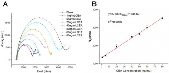 (A) EIS responses of the electrochemical aptasensor for the detection of different concentrations of CEA. (B) The linear calibration plot between the electrode impedance and CEA concentrations.