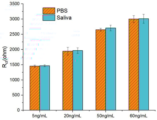 In order to explore the electrode detection performance in the complex saliva environment, we studied the saliva samples of healthy people. We measured the impedance values of CEA concentrations of 5 ng/mL, 20 ng/mL, 50 ng/mL, and 60 ng/mL in 10% healthy human saliva, and compared them with those of corresponding concentrations measured in 0.1 M PBS. As shown in Figure 7, when the CEA concentration is 5 ng/mL, the error of the impedance value measured in the saliva sample is 0.73%; when the CEA concentration is 20 ng/mL, the error of the impedance value measured in the saliva sample is 1.15%; when the CEA concentration is 50ng/mL, the error of the impedance value measured in the saliva sample is 2.07%. When the CEA concentration was 60ng/mL, the impedance error was 0.41%. The above results indicate that the electrode has good anti-interference performance in a complex salivary environment, and has a significant signal for CEA detection.