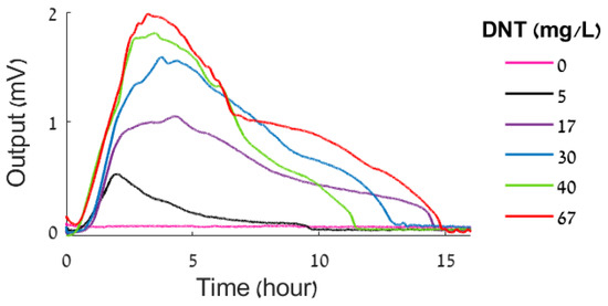 A set of DNT measurements employing the protocol described above is presented in Figure 3. The protocol was employed in identical sensor channels loaded with DNT bioreporters of the same batch. The sensors were exposed to 1 mL samples containing different concentrations of DNT mixed with the bioreporters. The results presented in Figure 3 demonstrate the fact that the bioluminescence produced by the bioreporters is dose-dependent, substantiating the underlying hypothesis at the basis of employing bioluminescent bioreporters for performing quantitative chemical sensing.