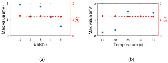 The standard ratio (SR) computed for two series of measurements: (a) different batches of bioreporters; (b) different temperatures. In blue are the maximal outputs of each BSM channel exposed to 30 mg/L of DNT and in red are the computed values of the standard ratio.
