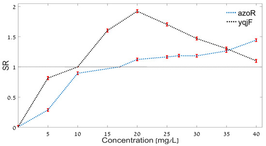 Calibration curves for two strains of bioreporters: yqjF (black); azoR (blue). The mean values of the SR and their standard deviation (denoted by the error bars) are presented (STD = 0.025). The gray dashed line denotes the standard solution (for which SR = 1).