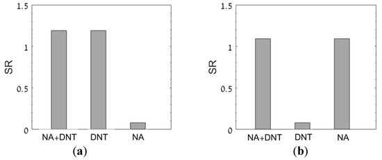 In real environemntal samples, such as in drinking water [36], it is highly likely the sample will contain more than one TM. The question then arises of whether the methodology presented here can be used for evaluating the concentration of a TM in a sample containing a mixture of different materials. This question was investigated by evaluating the SR in a solution containing a mixture of two TMs, DNT (30 mg/L) and nalidixic acid (NA, 10 mg/L) [37]. The SR values for both compounds were evaluated using the azoR and the recA bioreporters, respectively. The results, presented in Figure 6, show that each of the bioreporters responded only to its deignated TM, either singly or in a mixture, but not to the other chemical.