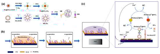 Tris(2,2j-bipyridyl)dichlororuthenium(II) hexahydrate tripropylamine (TPA), N-Hydroxysulfos sodium salt (sulfo-NHS), bovine serum albumin (BSA), 1-ethyl-3-(3-dimethylaminopropyl) carbodiimide (EDC), tween-20, and cellulose dialysis sacks (MW cutoff of 12,000) were purchased from Sigma-Aldrich (St. Louis, MO, USA). N-hexanol, cyclohexane and ammonium hydroxide (25 wt%), MES hydrate, 3-(Triethoxysilyl)propylsuccinic anhydride, tetraethyl orthosilicate, tetraethyl orthosilicate (TEOS, >99.9%), K2PtCl4, NaBH4, and LiClO4 were obtained from Aladdin Co., Ltd. (Shanghai, China). HCl, H2SO4, NaOH, H2O2, ethanol, and acetone were obtained from Shanghai Chemical Reagent Company (Shanghai, China). Amine-terminated sixth-generation PAMAM (G6-NH2 PAMAM) dendrimers were obtained from Chenyuan Co. (Weihai, China). The DynabeadsTM streptavidin trial kit was purchased from Invitrogen (Oslo, Norway). All of the reagents were of analytical grade. ITO-coated coverslips (22 × 40 mm, transmittance > 88% between 580 nm and 700 nm) with 15–30 ohm resistivity were provided by Human Troponin I-Cardiac (cTnI), and its mouse anti-human cTnI antibody (Biotin anti-cTnI antibody Ab1, coating Ab2) was purchased from Linc-Bio Science Co., Ltd. (Shanghai, China), as were the purified recombinant Troponin T-Cardiac (cTnT), myoglobin (Myo) antigen, human serum albumin (HSA), and carcinoembryonic antigen (CEA). SU-8 was obtained from MicroChem Corp Company (Westborough, MA, USA). Phosphate buffered saline (PBS) was purchased from Gibco (Waltham, MA, USA). Deionized water (DI, 18.2 MΩ) was used in all the experiments. UV-vis absorption spectra were determined using a spectrophotometer (Shimadzu, UV-2700, Kyoto, Japan) in a 1 cm quartz cell. The field emission scanning electron microscope (FESEM, Zeiss Sigma 300, Oberkochen, Germany) was used to observe the morphology of the samples. Transmission electron microscope (TEM) images were obtained using a JEM-3010 transmission electron microscope (JEOL Co., Ltd., Tokyo, Japan). Zeta potential (ζ-potential) analysis was performed with a Nano-Zetasizer (Malvern Instruments Ltd., Worcestershire, UK). All the electrochemical measurements, including cyclic voltammetry (CV) and chronoamperometry, were performed with the Reference 600 workstation (Gamry Instruments Co., Ltd., Warminster, PA, USA).