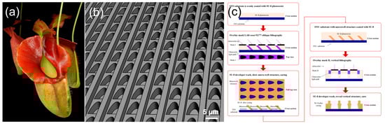 (a) Image of a pitcher plant (nepenthes), where the orange area is the peristome microstructures. (b) Illustration of the biomimetic NPS design for 2.8 µm size microparticle trapping. (c) Fabrication process of the biomimetic nepenthes peristome microstructures.