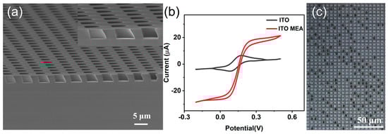 (a) SEM images for the cross-section view of semielliptical oblique microcavities. (b) CV curves of 5 mM ferricyanide on the bulk ITO electrode and ITO MEA at a scan rate of 50 mV s−1. (c) Bright-field microscope image of trapped IMB array on the biomimetic surfaces.