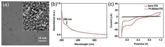 (a) TEM images of as-synthesized Pt-DENs. (b) UV-vis absorption spectroscopy of prepared Pt-DENs. (c) The electrochemical behavior of Pt-DEN-modified ITO and bare ITO electrode in the presence of 5 mM H2SO4 solutions.