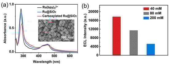 The absorbance spectrum and morphology of the Ru@SiO2 nanoparticles were characterized using UV–visible spectroscopy and scanning electron microscopy (SEM). The successful loading of Ru(bpy)32+ into the SiO2 NPs is demonstrated by the absorbance spectra in Figure 5a. Distinct peaks are observed at approximately 292 nm and 476 nm, which correspond to the π–π* electronic transition of bipyridine and metal-to-ligand charge transfer absorption, respectively. A slight red shift of the bipyridine absorbance peak is noted for the carboxylated Ru@SiO2. Furthermore, the Ru@SiO2 NPs exhibit a uniform, stable spherical structure with an average diameter of approximately 64 nm. The preparation condition of Ru@SiO2 loaded with different concentrations of Ru(bpy)32+ was optimized. It is observed in Figure 5b that the highest ECL response is obtained from Ru@SiO2 loaded with 40 mM Ru(bpy)32+.