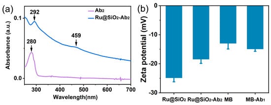 (a) UV–visible adsorption spectra of Ab2 antibody (blue line), and Ru@SiO2–Ab2 (purple line). (b) Zeta potentials of Ru@SiO2 and MB before and after conjugation with corresponding antibodies.