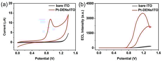 (a) CV curves of the Pt-DEN-modified ITO and bare ITO in the solution of 0.1 M PBS (pH = 7.0) in the presence of 0.16 M TPA. (b) ECL curves of the Pt-DENs/ITO and bare ITO electrodes in a solution of 0.1 M PBS (pH = 7.0) in the presence of 0.16 M TPA and cTnI IMBs.