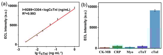 The proposed ECL immunosensor was utilized to detect various concentrations of cTnI in the presence of TPA. As shown in Figure 8a, an increase in cTnI concentration from 2.5 pg/mL to 1000 pg/mL leads to a corresponding increase in ECL signals. Furthermore, the ECL intensity exhibited a favorable linear relationship with the logarithm of the cTnI concentration. The limit of detection was calculated to be 0.38 pg/mL (S/N = 3). To validate the selectivity of the platform, we investigated its ECL responses using other protein biomarkers, including creatine kinase-myocardial band (CK-MB), C-reaction protein (CRP), myoglobin (Myo), and cardiac troponin T (cTnT) as nonspecific competitors. As demonstrated in Figure 8b, the ECL intensity of cTnI at a concentration ten times lower (125 pg/mL) was significantly higher than that of the other four interference biomarkers, indicating excellent selectivity of the magneto-immunosensor for cTnI; this was partly due to effective immunomagnetic separation. Moreover, the proposed immunosensor demonstrated an outstanding detection limit for the magneto-immunoassay in comparison to other ECL research on cTnI detection (see Table 1). The ECL system, electrode materials, and analytical performances, including detection limit and linear range in the sensing systems [33,34,35,36,37], are compared in Table 1. In the ECL immunosensing systems, most of the antibodies were immobilized on the surface of the electrode. Very few studies have been conducted using magnetic beads as support materials and separation tools through the specific molecular recognition. For example, Zhang’s group developed an ultrasensitive closed bipolar electrode–ECL (CBP-ECL) immunosensor based on a lateral flow assay for point-of-care testing (POCT) [38]. Although acceptable sensitivity (0.4416 pg/mL) was obtained, there was a slight deficiency in selectivity. In our study, a magnetically assisted electrochemiluminescence biosensor with enhanced ECL intensity was explored by developing single-layer immunomagnetic beads (IMBs) in the vicinity of the electrode surface, as well as excellent electrode modification for the improved electrooxidation of TPA.