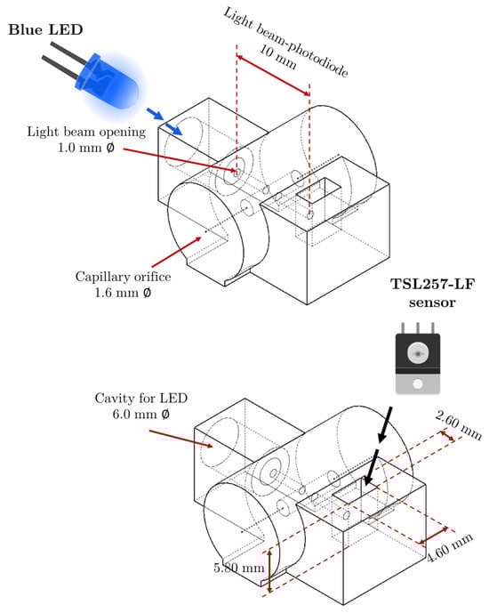 The print consisted of three main sections: a cavity for placing the light source (LED), a space with the appropriate dimensions to house a microhematocrit capillary tube (1.1–1.2 × 10−3 m D.I., length: 75 mm ± 0.5 mm) that served as the sample container and the carrier, which maintained a constant flow during the experiment, and a third section intended to read the TSL257-LF sensor for measurement (Figure 1).