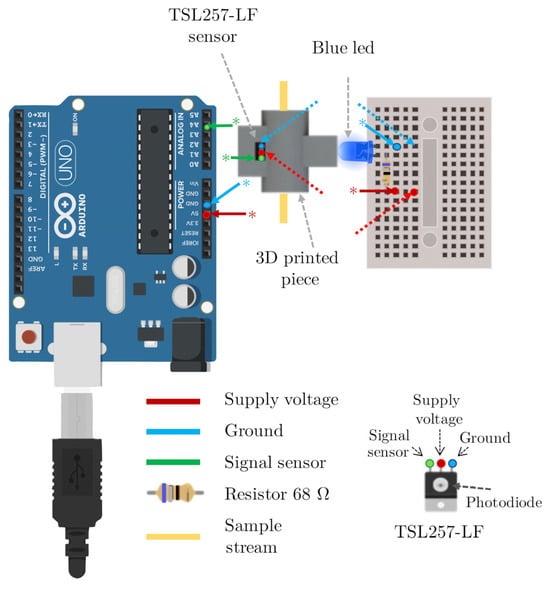 The TSL257-LF sensor (AMS Austriamicrosystems, Munich, Germany), which measures the intensity of visible light and converts it into a proportional electrical signal (voltage), was integrated into an electrical circuit that includes an Arduino UNO IDE 2.0 development board (Arduino, Ivrea, Italy), a blue LED and a 68-ohm resistor. All components were mounted on a mini breadboard (BusBoard Prototype Systems, Calgary, AB, Canada) using male-to-female and male-to-male jumper wires for the connections, which facilitated access and connection of the components, allowing for updates and modifications of the built system (see Figure 2). For data acquisition, communication was established between the Arduino UNO and a computer using a program developed in the Arduino IDE.