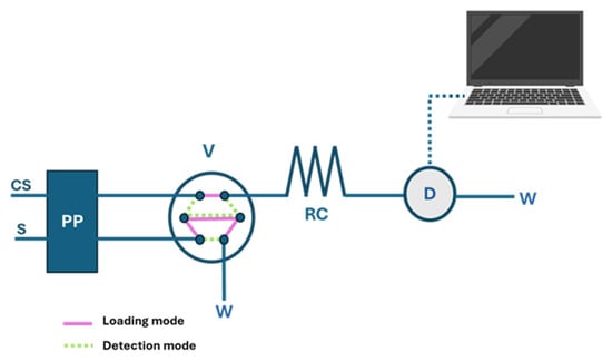 The FIA manifold was constructed using a four-channel Gilson Minipuls 3 peristaltic pump fitted with two propulsion silicone tubes to transport the carrier and the sample solutions (standard PVC two-spot 0.76 mm I.D.). The tubes were then connected to a manual 4-way valve (manual sample injector Gilson 210585), which controlled the direction of the flow. The valve was connected to a reaction coil (25 cm × 0.8 mm D. I.), which was subsequently connected to the detector and waste outlet (total path length to the detector was 40 cm). This scheme is illustrated in Figure 3. The flow rate was set at 0.5 mL min−1, and a sample volume of 250 µL was injected every 2:30 min.