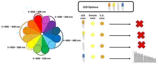 The following supporting information can be downloaded at: https://www.mdpi.com/article/10.3390/chemosensors12100216/s1, Figure S1: Three-dimensional-printed piece; Figure S2: (a) Alignment for the LED-capillary-photodiode light path. (b) Internal structure of the 3D printed piece; Figure S3: Mounting of the TSL257-LF onto the 3D printed piece; Figure S4: Alignment of the LED-capillary cavity-TSL257-LF; Figure S5: Construction of the circuit.