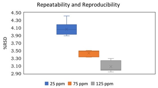 The reproducibility information for each concentration level is represented in a box plot diagram, which clearly shows that the smallest concentration level has the highest %RSD value, as can be seen in Figure 6.
