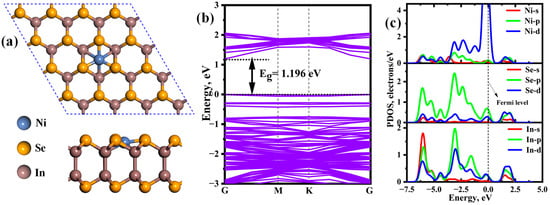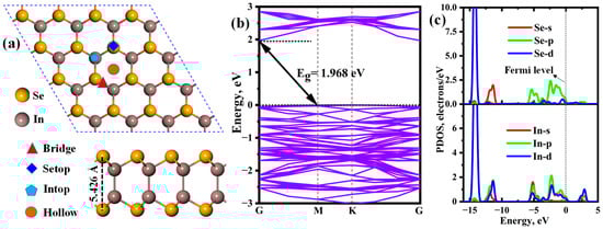 The crystal structure of 2D InSe is a layered hexagonal lattice, with each layer consisting of indium and selenium atoms arranged in a honeycomb pattern. The calculated lattice constant of the pristine InSe is approximately 4.07 Å with a space group of P-6m2. As shown in Figure 1a, the 4 × 4 × 1 supercell encompasses 32 In atoms and 32 Se atoms, with respective bond lengths of 2.804 Å and 2.676 Å for the In-In and In-Se bonds. These parameters match well with the previously reported results. The band structure and partial density of state (PDOS) of the InSe monolayer are depicted in Figure 1b,c. Notably, the single-layer InSe exhibits a semiconductor characteristic with an indirect bandgap of 1.968 eV, which is consistent with the reported data (2.02 eV) [,] and experimental result []. From Figure 1c, obvious hybridizations can be observed between Se-p and In-p, and d orbitals in the energy ranging from −6.00 eV to the Fermi level. Moreover, the s, p, and d orbitals of the In atom also overlap with the Se-s orbital, and there exists a significant resonance peak at about −14.30 eV due to the hybridization between the Se-d and In-d orbitals. This indicates that the strong In-Se covalent bond is formed, and, thus, the InSe possesses excellent stability.