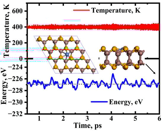 To explore the most stable Ni-InSe monolayer, different doping sites, including the bridge site, Setop site, Intop site, and hollow site, are considered for the Ni atom (Figure 1a). Following full relaxation, the largest binding energy occurs at the hollow site (−3.81 eV), followed by the bridge site (−3.76 eV), the Intop site (−3.25 eV), and the Setop site (−1.83 eV). Thus, the Ni atom is preferentially adsorbed on the hollow site, as depicted in Figure 2a. Moreover, it can be seen from Figure 2b that the introduction of the Ni atom causes the conduction band minimum (CBM) to shift towards the Fermi level, leading to a reduction in the bandgap from 1.968 eV to 1.196 eV. This indicates that Ni doping enhances the electrical conductivity of the InSe monolayer and is beneficial for improving its gas-sensitive properties. Additionally, as displayed in the PDOS of Ni-InSe (Figure 2c), the Ni-d orbital strongly interacts with the Se-p, In-p, and d orbitals within the energy of −7.00 eV to 2.50 eV, with several resonance peaks observed at approximately −6.00 eV, −3.08 eV, −0.15 eV, and 1.52 eV. Moreover, the Ni-p orbital also overlaps with the Se-d and In-s orbital in the whole energy range. As a result, two robust Ni-Se and Ni-In bonds are formed within the Ni-InSe monolayer. The stability of Ni-InSe is further assessed through an ab initio molecular dynamic (AIMD) simulation at 398 K, as shown in Figure 3. The temperature and potential energy of Ni-InSe display minimal fluctuations during the time of 10 ps, with no discernible disruption of existing bonding within the material. Thus, the Ni-InSe monolayer exhibits exceptional stability and holds promise as a highly efficient sensing material.