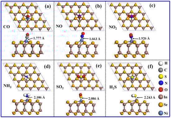 Atomic configurations of different adsorption systems: (a) CO/Ni-InSe, (b) NO/Ni-InSe, (c) NO2/Ni-InSe, (d) NH3/Ni-InSe, (e) SO2/Ni-InSe, and (f) H2S/Ni-InSe.