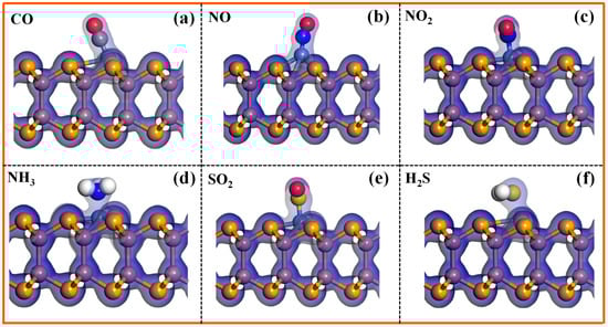To further reveal the microscopic bonding mechanism between the Ni-InSe and toxic gases, the total electron density (TED) and charge density difference (CDD) of the Ni-InSe monolayer adsorbing CO, NO, NO2, NH3, SO2, and H2S are calculated, and the corresponding results are detailed in Figure 5 and Figure 6. It can be seen that abundant electrons accumulate in the spaces between the toxic gases and Ni-InSe monolayer, as depicted by Figure 5a–f, illustrating that these gases and Ni-InSe share massive electrons, and, thus, strong interactions occur between them. Additionally, as shown in the CDD plots of Figure 6, the charge redistribution can be observed in the six adsorption systems after full relaxation. It is obvious that a large number of charges are gathered between the gases and the Ni-InSe monolayer, indicating their strong interactions. In particular, conspicuous electron-depleted regions are distributed around CO, NO, NH3, and H2S, and the electron-depleted regions of NH3 and H2S are larger than those of CO and NO, as illustrated by the blue areas in Figure 6a,b,d,f. Conversely, the electron accumulation regions gather around the Ni atoms of Ni-InSe. Consequently, CO, NO, NH3, and H2S donate 0.164 e, 0.082 e, 0.246 e, and 0.235 e to the Ni-InSe monolayer. By contrast, for the NO2 and SO2 adsorption systems, as shown in Figure 6c,e, a large number of electrons are accumulated around NO2 and SO2, with significant electron depletion regions appearing on the Ni-InSe surface. Thus, the Ni-InSe monolayer gain approximately 0.223 e and 0.04 e from the NO2 and SO2, respectively, and functions as an electron acceptor. In conclusion, the analyses of both TED and CDD plots suggest that the six toxic gases strongly interact with Ni-InSe through chemical adsorption.