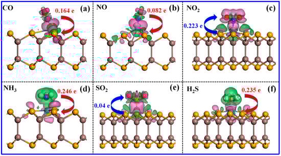 Charge density difference (CDD) of different adsorption systems: (a) CO/Ni-InSe, (b) NO/Ni-InSe, (c) NO2/Ni-InSe, (d) NH3/Ni-InSe, (e) SO2/Ni-InSe, and (f) H2S/Ni-InSe. The iso-value of CDD is ±0.005 e/Å3; the pink and green regions represent the electron gains and losses, respectively.