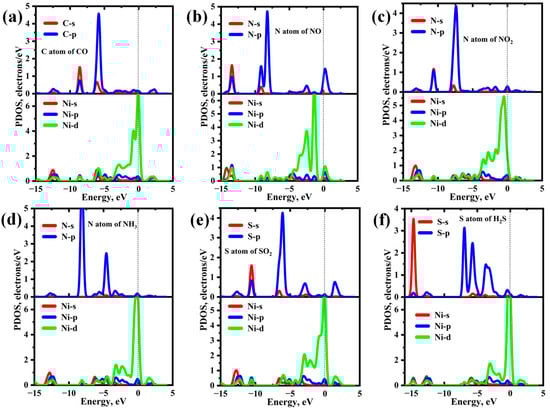 Figure 7 presents the partial density of states (PDOSs) of different adsorption systems. For the CO adsorption system (Figure 7a), the strong affinity of Ni-InSe towards NO stems primarily from the hybridization between the C-p and Ni-d orbitals within the energy range of −13.00 eV to 2.75 eV, yielding several discernible resonance peaks at about −12.50 eV, −8.60 eV, −5.80 eV, and 2.20 eV. Additionally, the C-s orbital strongly hybridizes with the Ni-p orbital within the energy range of −10.00 eV to −5.00 eV, resulting in two significant resonance peaks at approximately −8.60 eV and −6.10 eV. Consequently, a strong Ni-C covalent bond is formed in the CO/Ni-InSe system. In the cases of the NO, NO2, and NH3 adsorption systems, as depicted in Figure 7b–d, a notable overlap is observed between the N-s, and p orbitals of the three gases and Ni-d orbitals within the energy range spanning from −15.00 eV to 2.00 eV. Moreover, the number of resonance peaks for the NO adsorption system exceeds those for the NO2 and NH3 adsorption systems. Consequently, Ni-InSe shows a stronger adsorption capability towards NO in comparison to NO2 and NH3. With regard to the SO2 and H2S adsorption systems, the robust adsorption affinity of Ni-InSe for these two gases is primarily attributed to the hybridization between the S-p and Ni-d orbitals. Conversely, the orbital overlap between N-s and Ni-s, and p is relatively limited at similar energy levels. Particularly, the SO2 adsorption system (Figure 7e) displays four pronounced resonance peaks at −14.70 eV, −13.00 eV, −5.80 eV, and −3.05 eV, with comparable resonances also observed in the H2S adsorption system. Thus, Ni-InSe exhibits comparable affinities for SO2 and H2S through chemisorption.