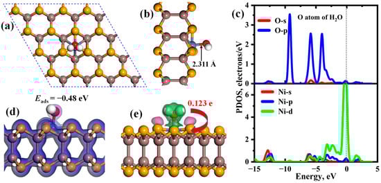 The emission of toxic gases usually occurs in humid atmospheres, making it crucial to study the impact of water molecules in the air. The most stable structure, PDOS, TED, and CDD of a single H2O adsorbed on Ni-InSe monolayer are displayed in Figure 8. It is found that the Ni-InSe exhibits the weak adsorption strength of H2O due to the small adsorption energy of −0.48 eV. And the H2O is adsorbed on the top of the Ni atom with the adsorption distance of 2.311 Å, which is slightly smaller than the sum of the radii of Ni and O atoms (2.25 Å). Moreover, there are a few electrons shared between H2O and Ni-InSe, as indicated by Figure 8d. Thus, the adsorption of H2O belongs to physisorption and mainly interacts with the Ni-InSe monolayer through the van der Waals’ force.